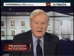 Chris Matthews, on Monday's Hardball, used the attempt on Gabrielle Giffords' life, to not only portray America as some sort of gun crazed country, but also to blame the likes of Sarah Palin and Michele Bachmann for political violence as he blurted: "Sarah Palin using gun play language. What is she talking about crosshairs and reloading...and Bachmann out there with her kind of talk. I mean it seems like the way people talk now has, has gotten more ballistic...Why are guns talked about so much, especially on the right? Why?"