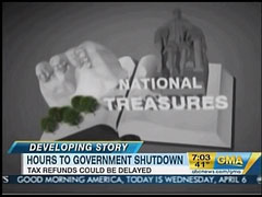On this Wednesday's edition of ABC's Good Morning America, Jonathan Karl tallied the services that could be at risk this time around, as he warned: "If they don't reach a deal and get it passed by then, American troops, including those on the front lines in Afghanistan and Iraq, may not get their paychecks. And smack in the middle of tax season, that refund you've been counting on, well, you may have to wait." Karl went on to alert travelers that: "Treasures like Old Faithful and Yellowstone, Mount Rushmore, Yosemite's half dome, will be closed to visitors. And if you don't already have a passport, don't even think about leaving the country. Last time the government shut down, 200,000 passport applications were stopped in their tracks."