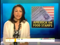 As noted earlier, CBS News did manage to talk to two different people relying on the food stamp program. During a Wyatt Andrews "American Spirit" story about a single mom who took in eight children after her sister drowned, aired on the March 9 Evening News with Katie Couric, Andrews noted that the law firm clerk was aided by "food stamps and church donations" for "help with the impossible grocery bills."