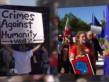 On the October 5 Nightly News, NBC’s Brian Williams trumpeted: “While it goes by the official name ‘Occupy Wall Street,’ it has spread steadily and far beyond Wall Street, and it could well turn out to be the protest of this current era.” ABC’s weekend evening news anchor David Muir, on the October 9 World News, hailed: “Look at the images coming in tonight, spelling out the anger. This sign in New York, ‘The rich get bailed out, the poor get sold out.’”