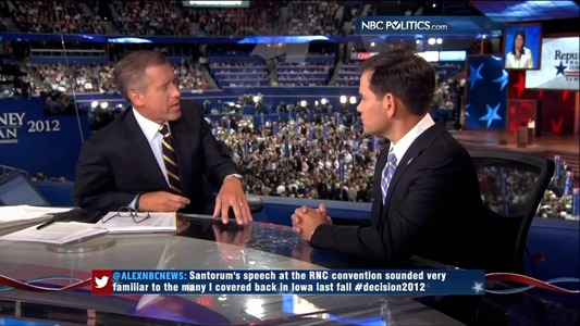 Brian Williams wasted no time, on NBC’s live Tuesday GOP convention coverage, in bringing up the Todd Akin controversy, as he pressed Florida Republican Senator Marco Rubio if he was worried about the “rape debate” surrounding his party. In fact, all of the NBC Nightly News anchor’s questions were negative as he pestered Rubio about the “closed-in” nature of nominee Mitt Romney and the “language” of the GOP’s platform. (video after the jump)