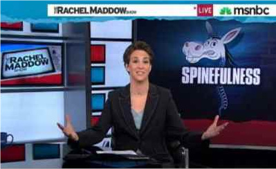 Atypical "spinefulness" from Democrats, Maddow claims, citing a word she made up for the occasion. Maddow, however, remains craven as ever. Even the source she cited, Greg Sargent at the Washington Post, undermined her claim. Contrary to what Maddow asserts, Democrats aren't scheduling a vote "on a tax cut for all income up to a quarter million dollars." Instead, as Sargent points out, Hoyers said Democrats will "get to vote this year on just (emphasis in original) extending the Bush tax cuts for the middle class."