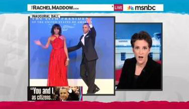 MADDOW (after Jennifer Hudson finishes overripe rendition of Al Green's "Let's Stay Together"): President Obama and Mrs. Obama dancing at the official inaugural ball tonight, being serenaded by Jennifer Hudson for the second time. She also serenaded them (much like we do every day at MSNBC) at the commander in chief ball. "Let's Stay Together" of course is A) Al Green, so always great, B) a nice metaphor for, thank you for picking me again to be your president for four more years, and also C) a nice reminder of the president's turn at the microphone at a fundraiser, I believe it was last year, singing a little Al Green himself, a nice reminder of that tonight. (operative word here -- nice). But the president and first lady, I do believe (Maddow morphing into Scarlett O'Hara ... I do believe you've been ignoring me, Ashley Wilkes ...) that is the last time that we will see them dancing tonight.