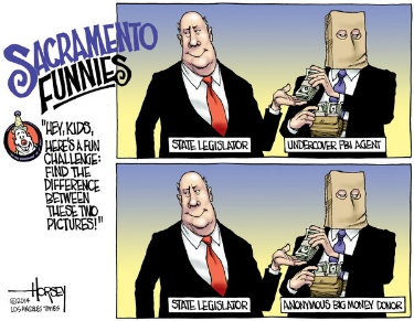 "Is the welfare of the Bear Republic more threatened by a few legislators who receive illegal bribes or by an entire breed of politicians who take legal campaign donations from unnamed billionaires with an ideological agenda?" Horsey asked. One need not be a weatherman, to borrow from Bob Dylan, to see which way this man's apologia is blowing.