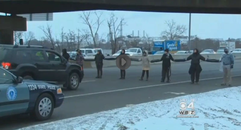 On Interstate 93 in Milton just south of Boston, the protesters chained themselves to heavy barrels spread across the highway, the busiest leading into the city, while on I-93 in Medford to the north they formed a human chain across the road by fastening their arms in plastic pipe. Police forcibly removed the protesters, using power saws to cut through the barrels. Traffic didn't start flowing again in Milton until nearly 10 a.m., reportedly about two hours after the protesters arrived, although those in Medford were removed more quickly.