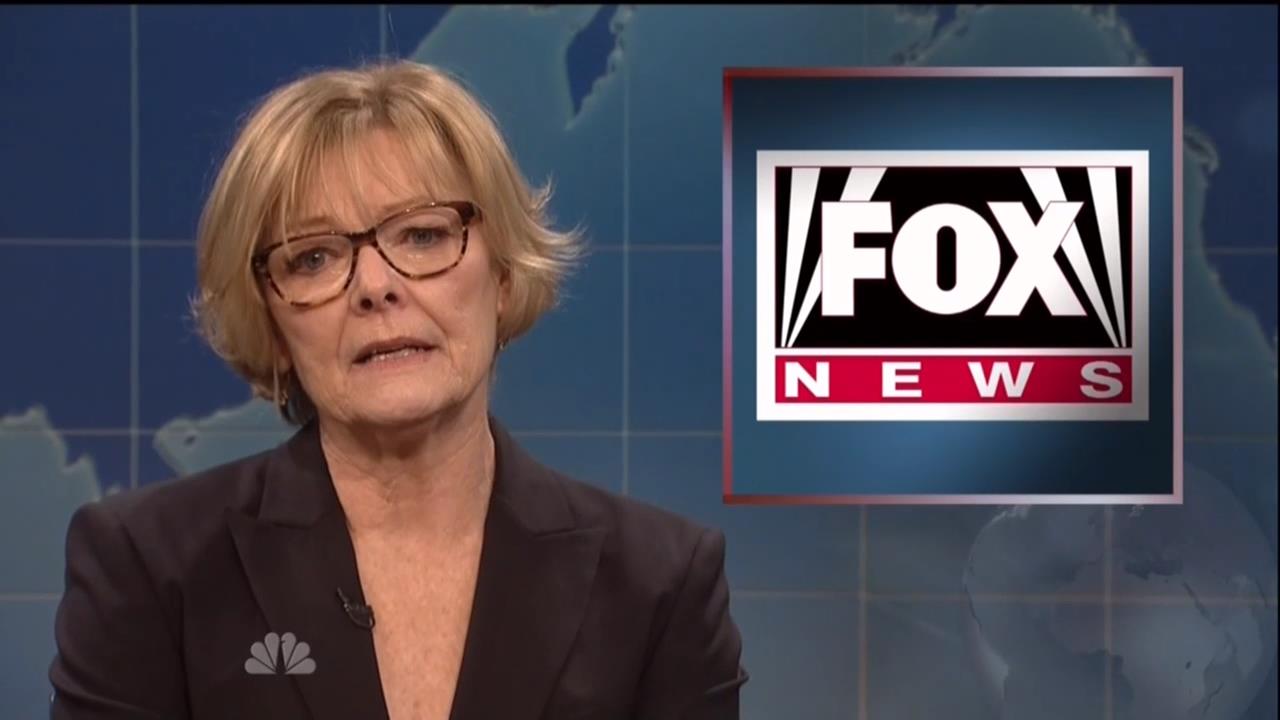CURTIN: Times have changed since I first sat behind this desk. For example, I used to be the only pretty blonde woman reading the fake news. Now there's a whole network devoted to that. (graphic shown of Fox News logo). And somehow I showed less cleavage. (photo shown of Curtin during '70s-era SNL, blouse open to reveal her bra, and Fox's Elisabeth Hasselbeck in low-cut attire).