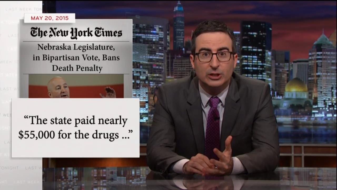 On his HBO program Sunday night, former Daily Show correspondent John Oliver mocked the efforts of Nebraska Governor Pete Ricketts to acquire the drugs needed for the lethal-injection execution of an inmate after the solidly Republican state legislature voted to end capital punishment in Nebraska. The new law won't take effect for three months.