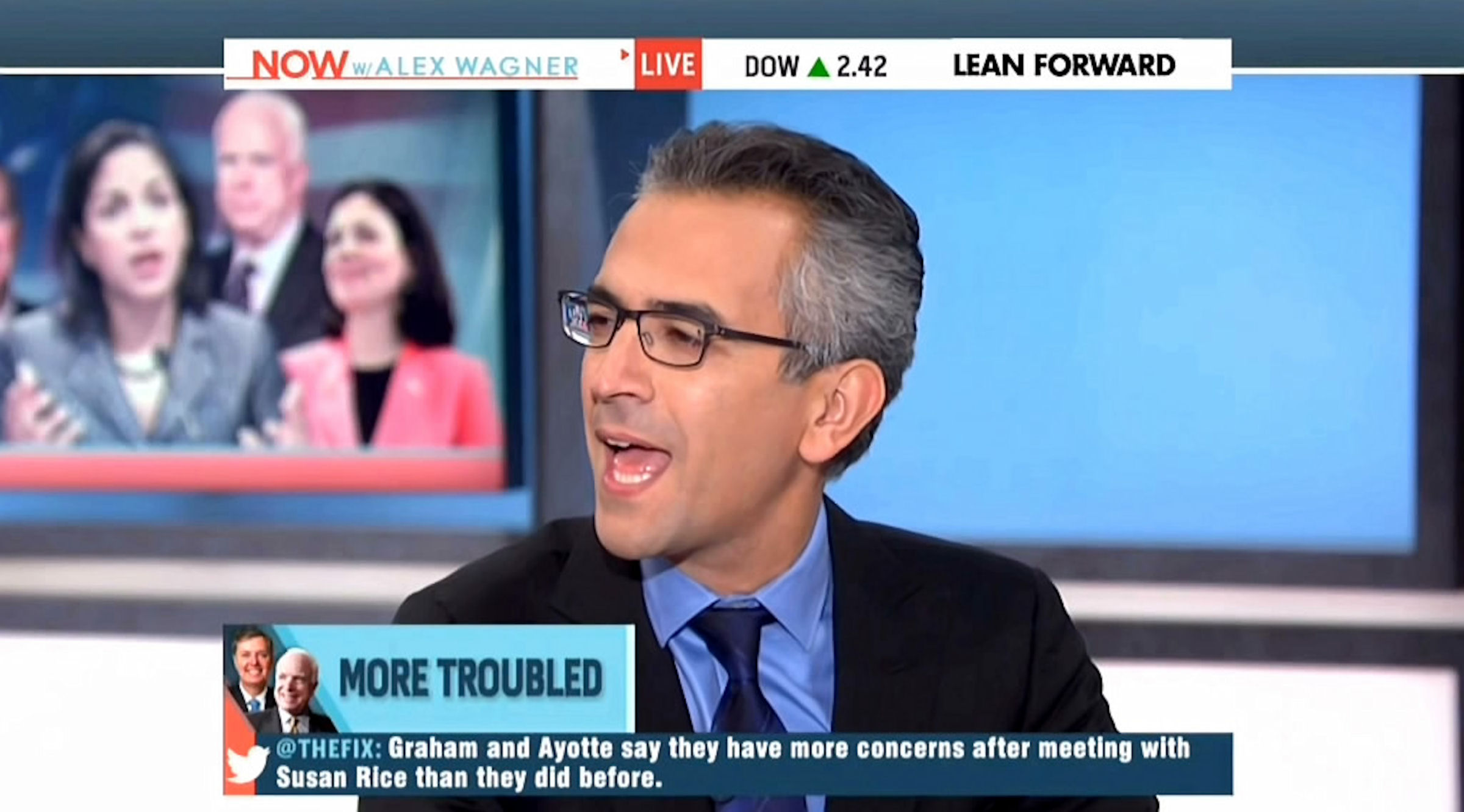 WOLFFE: About Benghazi that they should be investigating. What is troubling is that four Foreign Service officers died. What is truly troubling on top of that, is that these Senators apparently believe that going on a talk show, even a series of Sunday talk shows, makes you responsible for the security of people in the field. They know that's not the case. They know that Susan Rice isn't the line manager responsible for security. Didn't block the right security for these officials or funding thereof. She's not part of the CIA. She was out there doing what they do on Sunday talk shows, which is talking about a whole range of subjects. I suspect that if you asked John McCain in an honest moment about whether he was truly expert in all the things he talks about – in his many Sunday talk show appearances, he would say that occasionally he ventured into territory that he wasn't personally responsible for and that's where you get into the question of why it's not just me, it's the op-ed board, the editorial board of The Washington Post that has said this is bizarre. Why are they pursuing Susan Rice like this? There are very troubling questions about these senators and their witch hunt that they have engaged in.