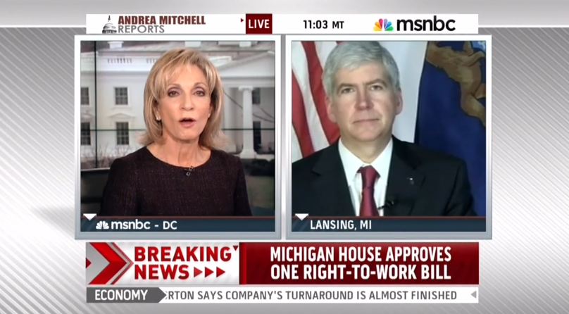 Appearing on Tuesday’s Andrea Mitchell Reports, Ms. Mitchell took it upon herself to hammer Governor Rick Snyder (R-Mich.) over his decision to sign a bill making Michigan the 24th right to work state. She later followed up the Snyder segment with a friendly chat with liberal columnist Ruth Marcus and later with a softball interview with the Rev. Jesse Jackson and a United Auto Workers union boss. [See video below page break. MP3 audio here.]