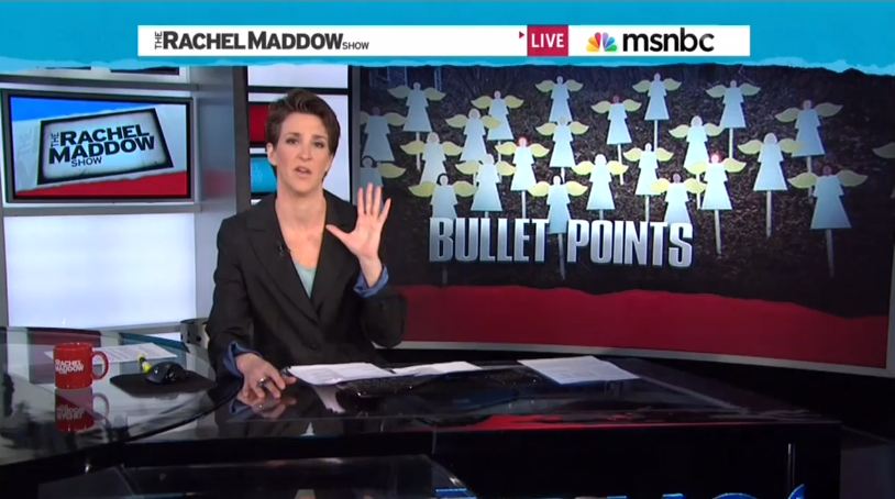 Speaking last week, Maddow aired footage of McCain addressing a constituent whose son was killed last year at a movie theater in Aurora, Colorado, who spoke to Senator McCain about her belief that “These assault weapons allow a shooter to fire many rounds without having to reload. These weapons do not belong on our streets.”  [See video after jump.  MP3 audio here.]