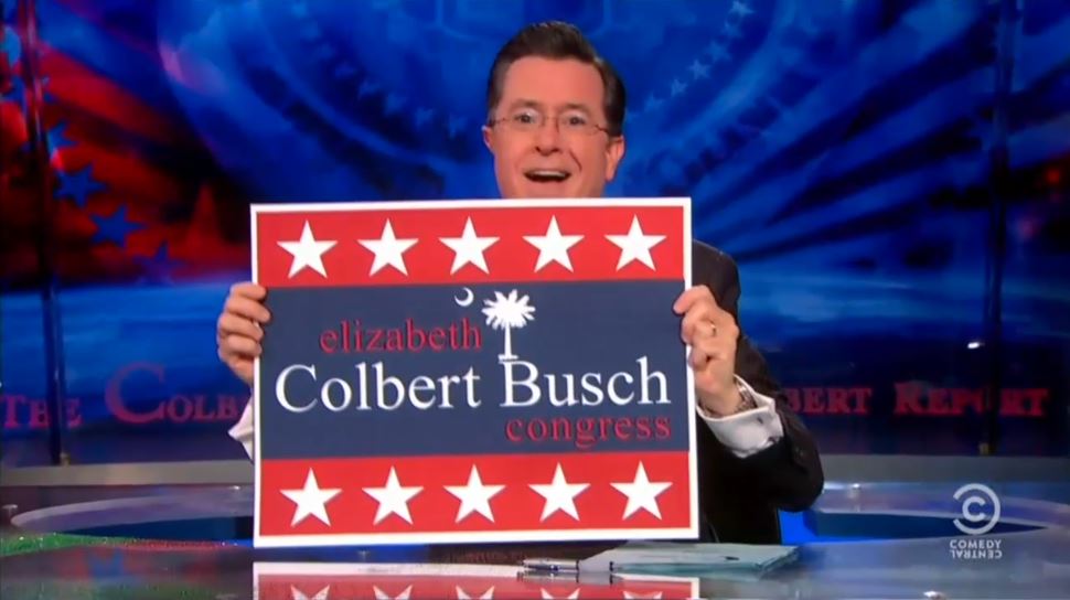 Colbert began the segment by pretending to make a campaign poster for his sister before holding up an official Elizabeth Colbert-Busch campaign poster. Colbert jokingly claimed that it was a Morning Joe interview with Colbert-Busch’s opponent, former South Carolina Governor Mark Sanford, that inspired Colbert to comment on the race: