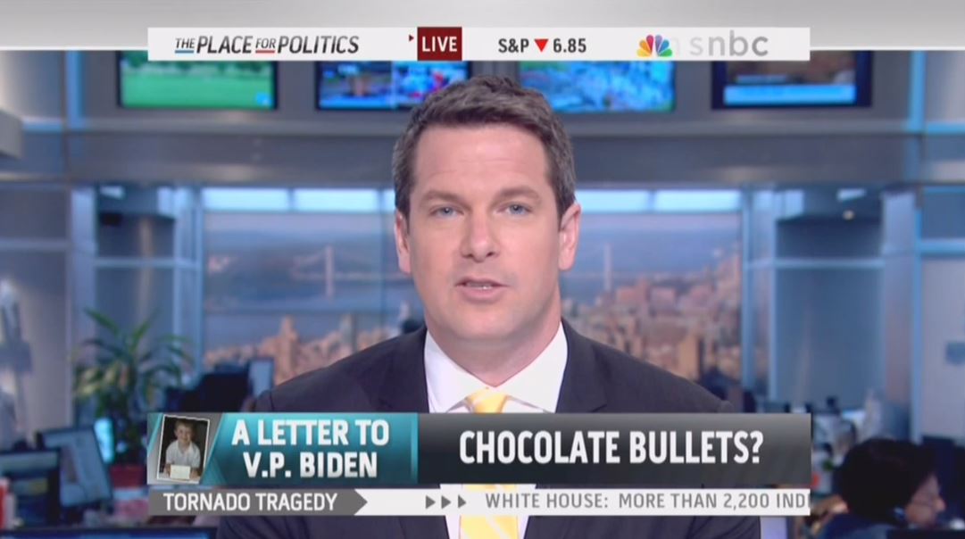 Take Thomas Roberts, who on the May 24 edition of his 11 a.m. MSNBC Live program interviewed 7-year old Myles Nelson who imaginatively "came up with an idea for using chocolate bullets instead of real ones in the aftermath of the Newtown shooting."
