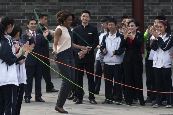 Writing on Tuesday’s March 25, Thompson puffed up “History and jump-rope as first lady visits Xi’an” before providing a glowing description of Mrs. Obama’s “five-hour sightseeing tour, giving her and her family a view of China’s long history- plus a little jump-roping on the side.”