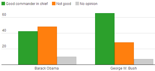 The piece, written by Scott Clement of Capital Insight, also pointed out that Democrats are more than twice as likely to say Bush was a good commander in chief as Republicans are to say Obama is (46 percent vs. 17 percent). As of now, this piece only exists on the Washington Post website, but given that the findings are a product of the Post itself, one wonders if the Post will include the article in its print newspaper despite it showing bad news for President Obama. [EDITOR'S UPDATE: The poll did not appear in Thursday's newspaper. A 3,100-word front page story on vets used four questions from the poll, but the story never even had the name "Bush" in it.]