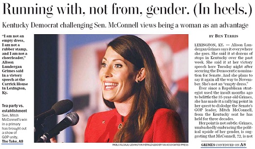 Ever since a Republican strategist used the insult [empty dress] months ago to belittle the 35-year-old Grimes, she has made it a rallying point in her quest to dislodge the Senate’s GOP leader, Mitch McConnell, from the Kentucky seat he has held for three decades. Her point is not subtle. Grimes, unabashedly embracing the political upside of her gender, is suggesting that McConnell, 72, is not taking this female challenger (or other women) as seriously as he should.