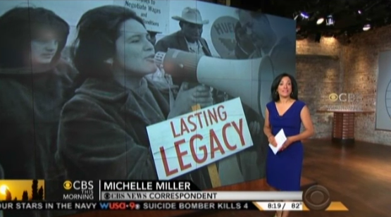 CBS correspondent Michelle Miller began her 5 minute report by gushing over Ms. Huerta and described her as someone who “co-founded the United Farm Workers union with Cesar Chavez, fought for feminism with Gloria Steinem and battled for social change.” [See video below.]