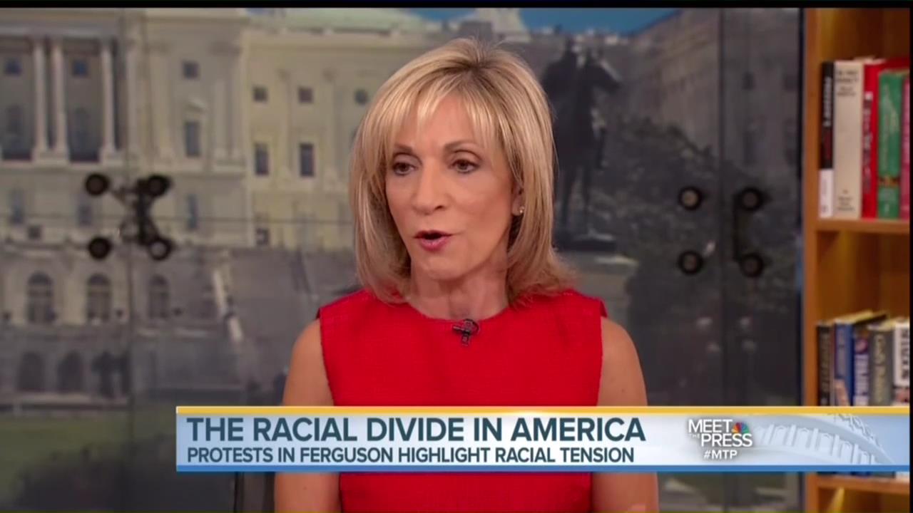 Filling in as host on NBC’s Meet the Press, Andrea Mitchell, NBC's Chief Foreign Affairs Correspondent and host of MSNBC's Andrea Mitchell Reports, rushed to defend her colleague Al Sharpton for his involvement in the Ferguson protests.