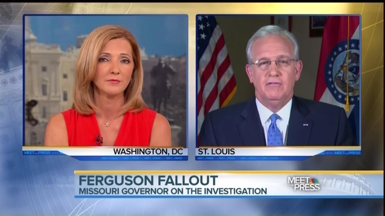 Chris Jansing, NBC News Chief White House Correspondent, filled in as moderator on Meet the Press and did her best to hit Governor Jay Nixon (D-MO) from the left over his handling of the ongoing violence in Ferguson, Missouri.