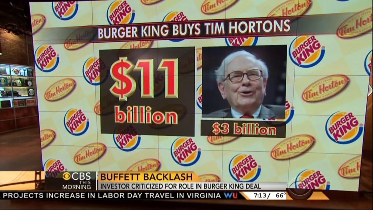 GAYLE KING: Billionaire investor Warren Buffett is facing criticism this morning for his role in the Burger King takeover of Tim Hortons. The fast food giant confirmed yesterday it’s buying the Canadian coffee and doughnut chain for $11 billion. Now this deal is being financed with $3 billion from Buffett’s company that’s Berkshire Hathaway.