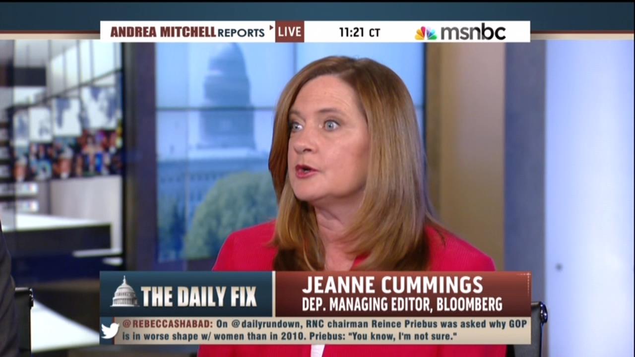 Appearing on MSNBC’s Andrea Mitchell Reports on Thursday afternoon, Jeanne Cummings, Deputy Managing Editor for Bloomberg News, decided to attack the GOP over their supposed problem with female voters.