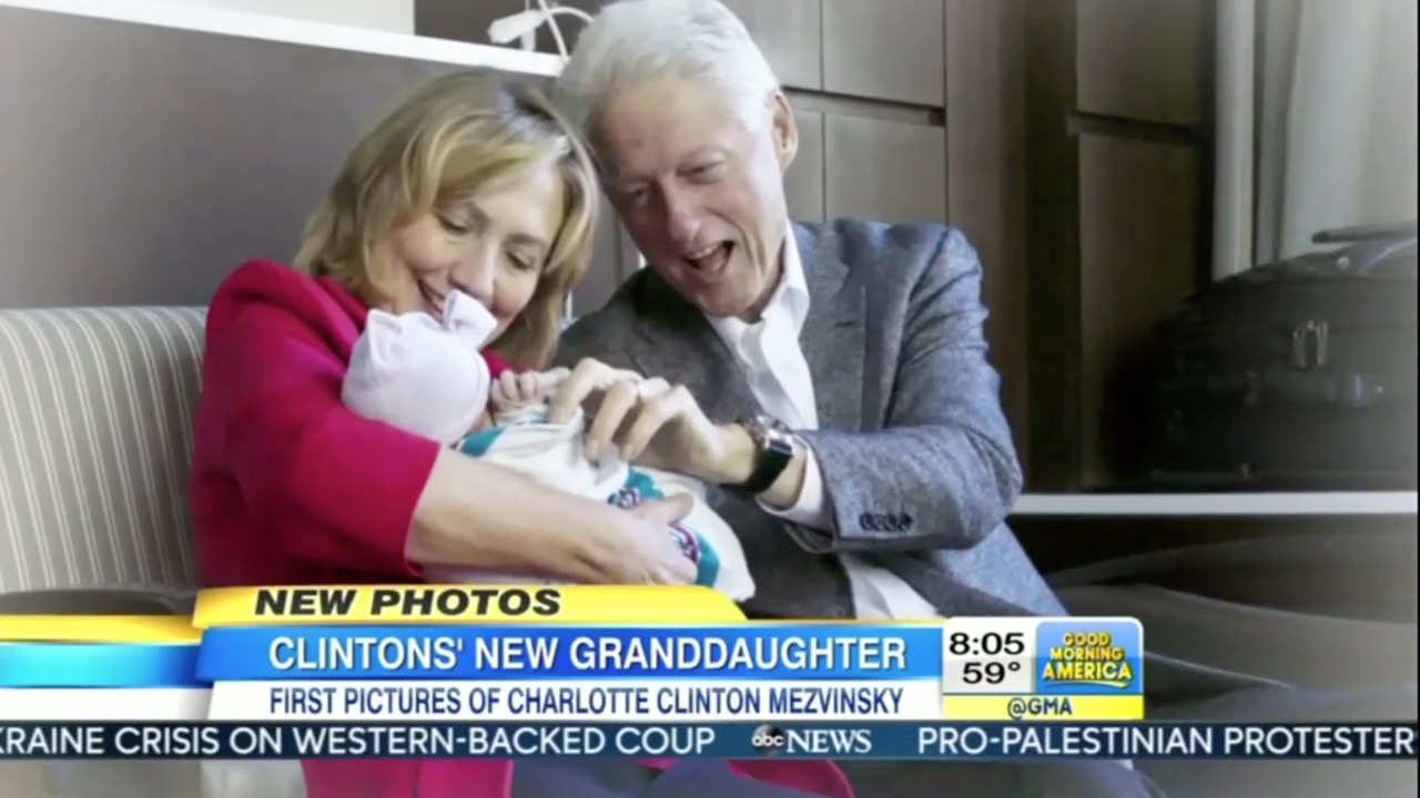 Over on ABC, Schiavocampo read off a flurry of tweets from the Clinton family announcing the birth of their granddaughter before she announced “Chelsea delivering at Lenox Hill Hospital in New York City, a go-to for high-profile mommas like Beyoncé. The family has been looking forward to this new journey for some time. Clinton telling George he has high hopes for his new heir.”