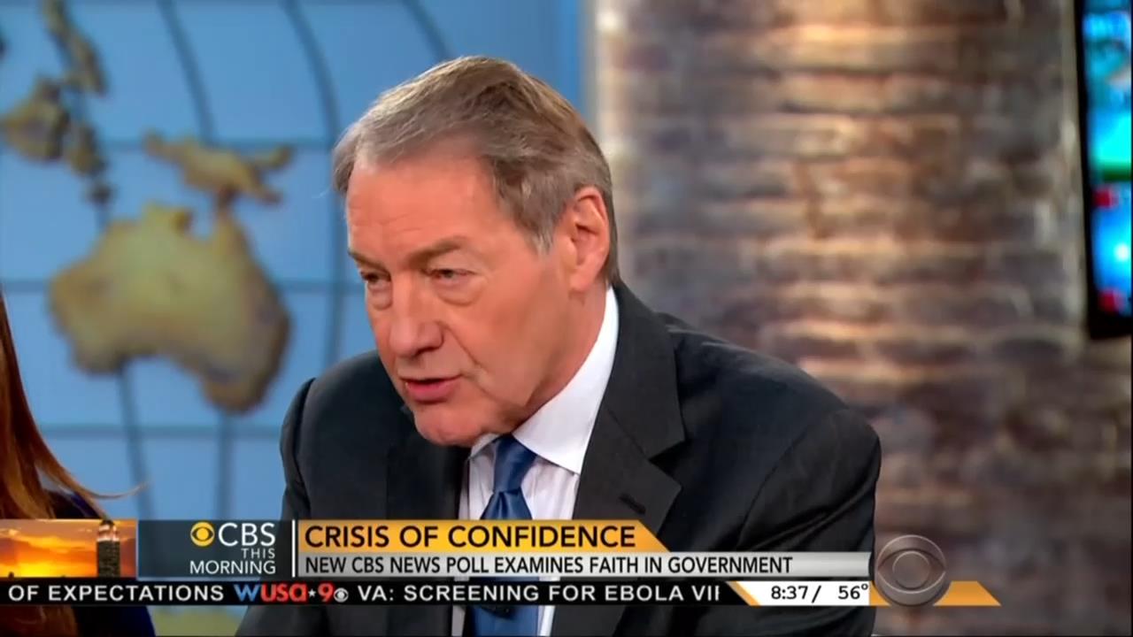 On Friday, CBS This Morning hosted CBS News Political Director John Dickerson and pollster Frank Luntz to discuss America’s declining trust in government including its recent handling of the Ebola crisis. Despite two-thirds of Americans supporting a travel ban on Ebola stricken countries, co-host Charlie Rose did his best to dismiss such concerns by the public.