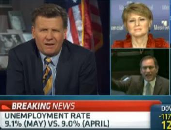 Santelli was the only one on CNBC to come close to the actual data of 54,000 jobs added. The May gains were less than one-fourth the size of April's gains. The unemployment rate also climbed to 9.1 percent. Reuters and other outlets immediately called the gains "less than expected," but even CNBC's predictions revealed that many in the media refuse to see the weakness of the economy and remained convinced the economy is in "recovery."