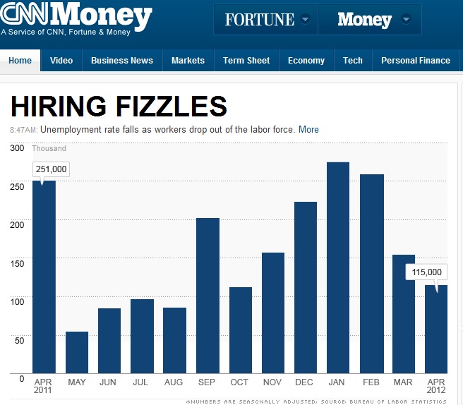 About 45,000 fewer jobs were added in April than economists expected, and the unemployment rate dropped to 8.1 percent due to more than a half million people giving up the job search. CNN Money reacted with the headline “hiring fizzles.”