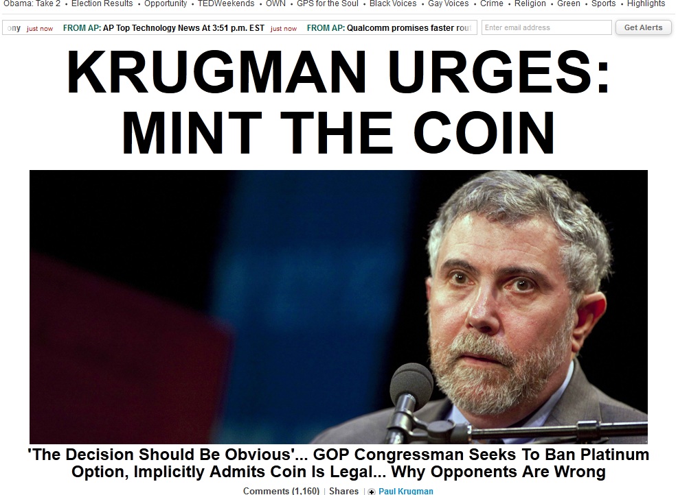 The Huffington Post has pushed the idea over and over and were at it again on Jan. 7. That afternoon, Nobel prize-winning economist Paul Krugman was in the top story on the homepage, “KRUGMAN URGES: MINT THE COIN” blared the headline across the top of HuffPo. Beneath the enormous picture of Krugman it said “‘The Decision Should Be Obvious’ ... GOP Congressman Seeks to Ban Platinum Option, Implicitly Admits Coin is Legal... Why Opponents Are Wrong.” On Jan. 9, HuffPo gleefully reported that the White House “Doesn’t Completely Rule It Out” after the press secretary dodged a question on the subject.