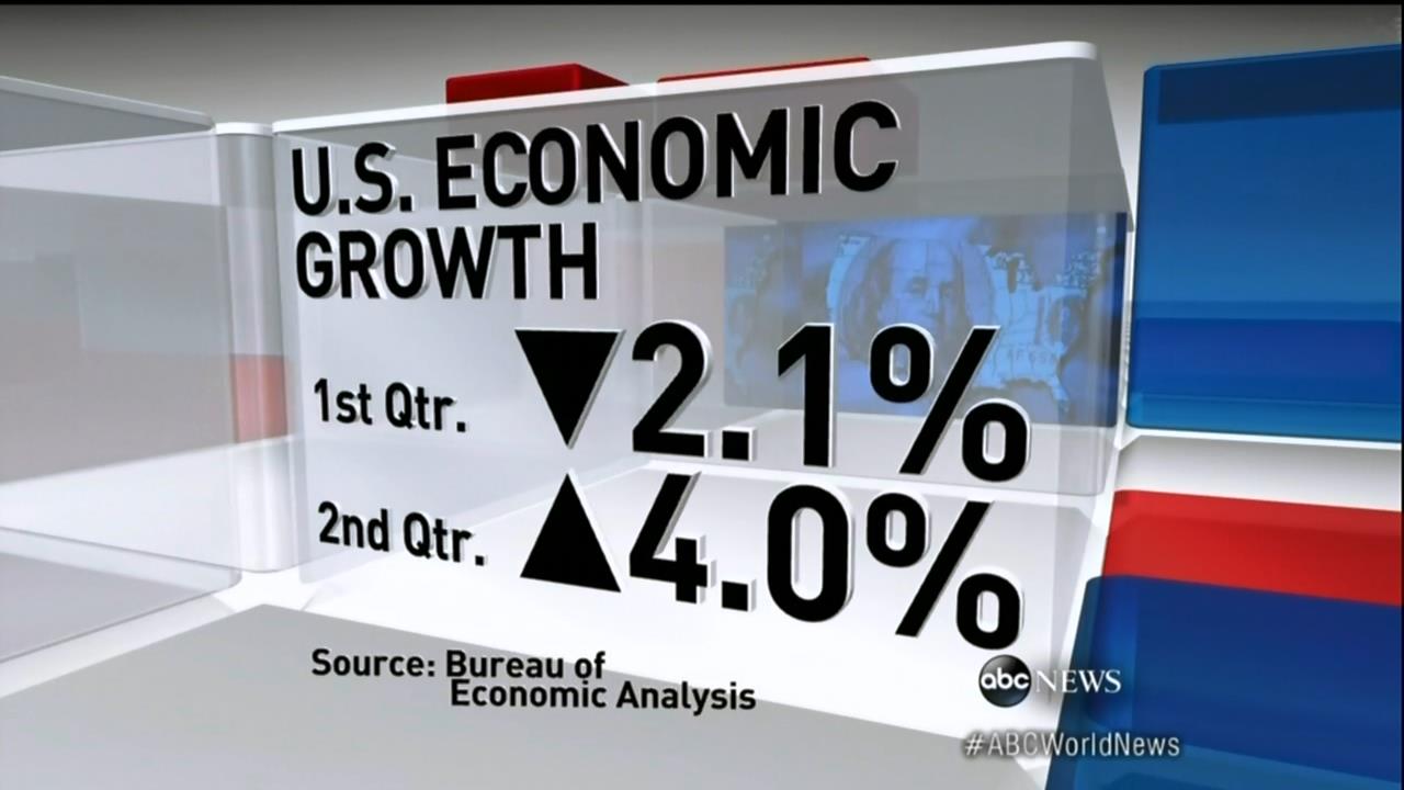 ABC “World News” anchor Diane Sawyer called it a “sign of life from the fragile U.S. economy” and attributed the “rebound” to consumer spending. NBC “Nightly News” anchor Brian Williams called it “good news” saying, “GDP grew at a healthy 4 full percent rate in the spring, surpassing expectations, while bouncing back from a tough winter during which economic activity dropped.”