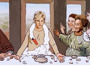 The West Hollywood artist illustrates a lesbian feast, where talk show host Ellen DeGeneres replaces Jesus and other stars, such as Portia de Rossi, Rosie O’Donnell, Rachel Maddow, and Wanda Sykes swap spots with the apostles.