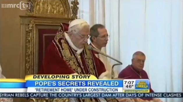 For Pope Benedict XVI’s retirement, ABC anchor George Stephanopoulos began the trend during “Good Morning America” and called Pope Benedict XVI’s role a “papacy, still shadowed by scandal” before pointing to the Italian press and suggesting the pope resigned after reports of various scandals. He also happened to be “struck by” John Thavis’ book, “The Vatican Diaries,” which noted that Pope Benedict XVI’s mission was to “decontaminate the church.”