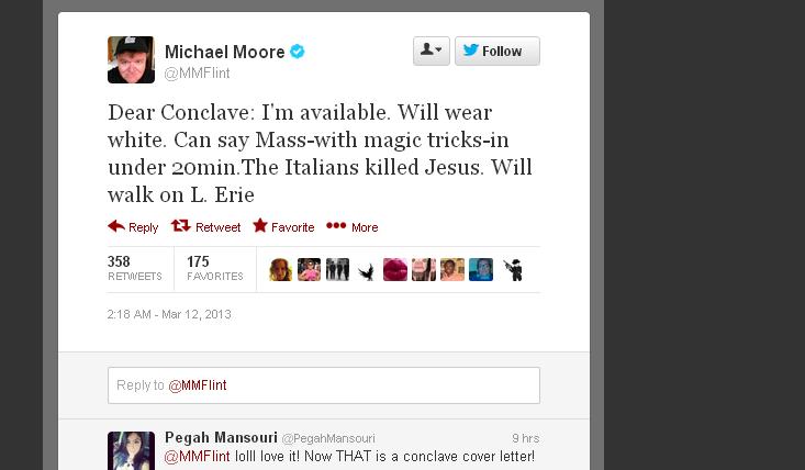 As the conclave launched, Moore couldn’t help but nominate himself for the papacy, and ranted via twitter, “Dear Conclave: I'm available. Will wear white. Can say Mass-with magic tricks-in under 20min.The Italians killed Jesus. Will walk on L. Erie.”