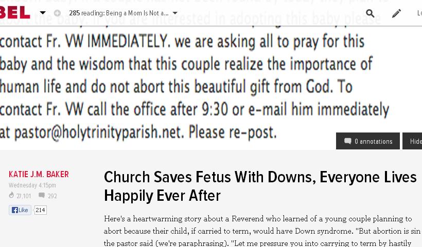 Katie J. M. Baker recently bashed a pastor for rescuing an unborn Down Syndrome baby from abortion, insisting that “so many mistreated babies and kids with Downs live terrible lives” in Jezebel, a feminist blog detailing “celebrity, sex, fashion for women.” Rev. Thomas Vander Woude, a Catholic priest located in Gainesville, Va, offered to help the 6-month-pregnant mother of a Down Syndrome baby to locate an adoptive family as an alternative to abortion. When Father Vander Woude sent the alarm via social media begging for prospective parents, responses flooded in by the hundreds.