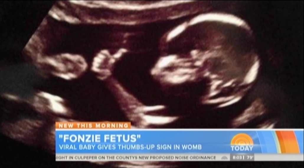 Other broadcast news shows followed suit the same day, with “Morning Joe” Co-host Mika Brzezinski noting the “baby” as well as “Fox and Friends” Co-host Steve Doocy. Fox’s lower third used both terms: “Baby Fonzie: Fetus Gives Thumbs-up in Ultrasound.”