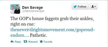 The blogosphere is abuzz today after anti-conservative bully and gay activist Dan Savage tweeted, “The GOP’s house faggots grab their ankles right on cue...Pathetic” in response to GOProud’s endorsement of Mitt Romney in the 2012 election.