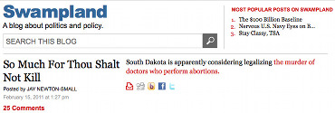 For its part, the TPM post about the legislation in question similarly uses an alarming, misleading headline, "South Dakota Bill Could Legalize Murder of Abortion Providers."