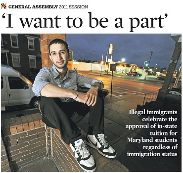 Today's Baltimore Sun devoted sympathetic front-page coverage to illegal immigrants who now "celebrate the approval of in-state tuition for Maryland students regardless of immigration status."