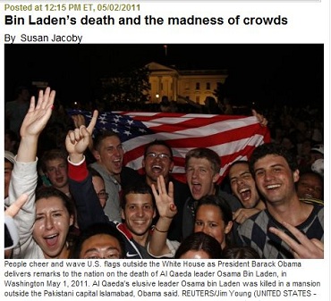 Washington Post columnist Petula Dvorak may have pulled her punches, calling Sunday night's spontaneous celebrations of bin Laden's demise "almost vulgar," but her colleague Susan Jacoby thoroughly trashed such displays as "mindless" in her "Spirited Atheist" column yesterday at the Post/Newsweek "On Faith" site: