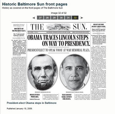 "Obama Traces Lincoln Steps On Way to Presidency" blared the January 18, 2009 banner headline, marking the then-President-elect's arrival in Baltimore to give a speech at the War Memorial Plaza.