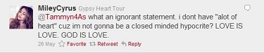 Cyrus may not be the outspoken "Born This Way" icon that Gaga is, but the kid gets props for shutting down – and openly expressing her disdain for -- intolerance this week. When a fellow Tennessean and self-professed Christian fan named Tammy Hudson took to Twitter to lament "what happened To that Christian girl from Tn with decent moral values and a lot of heart?" Cyrus promptly singled the woman out from among her over one million followers to call shenanigans. "What an ignorant statement," she wrote. "I dont have 'alot of heart' cuz im not gonna be a closed minded hypocrite? LOVE IS LOVE. GOD IS LOVE." It's a statement so forthright and so sadly lacking in Christian conservatism, we're willing to forgive Cyrus her "alot" and "cuz." (Hudson, meanwhile, was unmoved, elaborating later that "I didn't decide it was wrong to be gay. God did, I just follow his rules.")