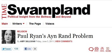 "I am fairly certain that when Paul Ryan first decided to publicly share his admiration of Ayn Rand, he could not have imagined it would lead to him speed-walking to his SUV to avoid a young Catholic trying to give him a Bible and telling him to pay more attention to the Gospel of Luke," Time's Amy Sullivan snarked in a June 3 Swampland blog post.