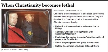 The Oslo bomber's manifesto undermines Brooks Thislethwaite's argument. Hopefully the Chicago Theological Seminary professor will issue a mea culpa, although if she doesn't, it's probably because it was too tempting to attack American evangelicals as potential terrorists: