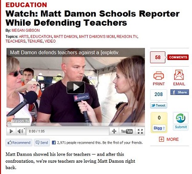 "Matt Damon showed his love for teachers — and after this confrontation, we're sure teachers are loving Matt Damon right back," Gibson enthused in an August 3 "Newsfeed" blog post entitled "Watch: Matt Damon Schools Reporter While Defending Teachers."