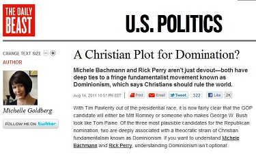 [O]f the three most plausible candidates for the Republican nomination, two are deeply associated with a theocratic strain of Christian fundamentalism known as Dominionism. If you want to understand Michele Bachmann and Rick Perry, understanding Dominionism isn’t optional.