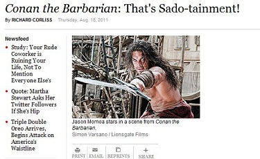 [M]en need myths, and perpetual adolescents need to see the pulp stories they loved as kids exhumed every few decades. So here's Hawaiian-Irish hunk Jason Momoa in Conan the Barbarian, a gaudily ornamented medieval banquet table groaning with junk food and open entrails.