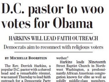 "Harkins brings the assets of Obama's Chicago church but without the baggage," Boorstein quoted one Terry Lynch, the "executive director of the Downtown Cluster of Congregations and a longtime activist in faith and politics in the District."
