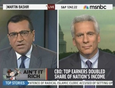 MSNBC's Martin Bashir tag-teamed with liberal pundit Jared Bernstein to slam Herman Cain and Rick Perry's tax plans today, insisting that both are a sop to the "rich" and an act of "class warfare" against the middle class. An onscreen bio graphic noted that Bernstein used to work for Vice President Biden, but that fact would go unnoted for any listeners to the program via MSNBC's SiriusXM satellite radio channel.