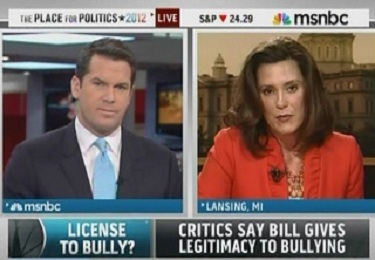Openly-gay anchor Thomas Roberts brought on Michigan state senator Gretchen Whitmer (D) to bash the Republican-controlled state senate for passing SB 0137, "Matt's Safe School Law," on to the state house of representatives containing a clause that holds that the law "does not prohibit a statement of a sincerely held religious belief or moral conviction of a school employee, school volunteer, pupil, or a pupil's parent or guardian."
