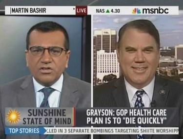 The mid-afternoon host proudly featured the ex-congressman in a segment entitled "Sunshine State of Mind," proudly reminding viewers that it was Grayson whose hallmark achievement in Congress was charging during debate on the House floor that Republicans want sick Americans to "die quickly" because they opposed ObamaCare.